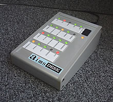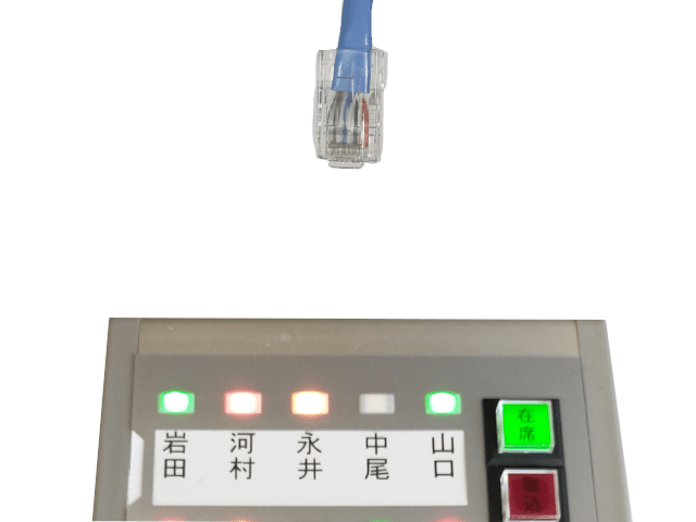 aims DESKは、在席状態を机上のボックスで表示する装置。町長以下16名の管理職員の方々の在席・離席状況をカンタン操作とリアルタイムでお知らせしています。庁舎には、すでに在席表示装置が設置されていましたが、老朽化していたことと、新たに追加するには専用信号線が必要でした。また離れた建物にいる方の在席状況を把握することはできません。パソコン操作に不慣れな方もおられます。
