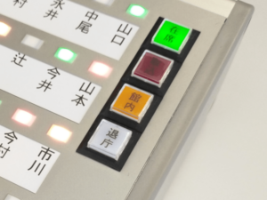 | PCやスマートフォンは必要ありません。電源スイッチを入れ、後はボタン操作のみで在席状況を切り替え周知が可能です。 | 秘書機能により、役員の在席状況を秘書が代行して自席で切り替えることもできます。 |
