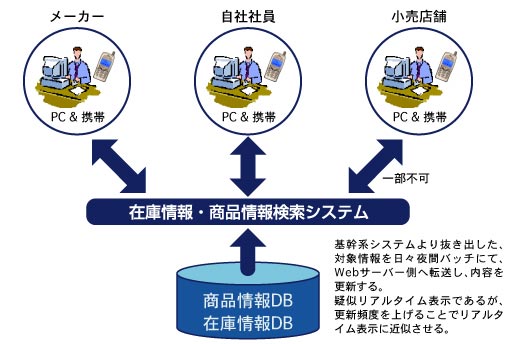 ここでご紹介する事例は、スマートフォン/携帯電話を端末とした在庫照会システムであり、利用者によって参照権限を付けることで情報提供側のデータ保護を実現しております。