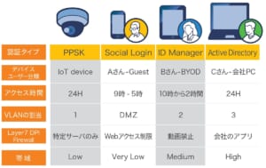 ユーザ毎に、認証タイプやアクセス時間、デバイス分類や使用するVLANの割当などを、きめ細かく設定することが可能です。