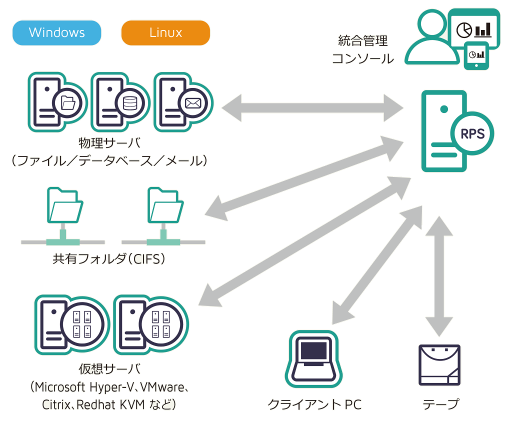 WindowsやLinuxのスタンドアロンサーバはもちろん、複雑な環境に対してもシステム全体をシンプルに管理し、バックアップ/リカバリできます