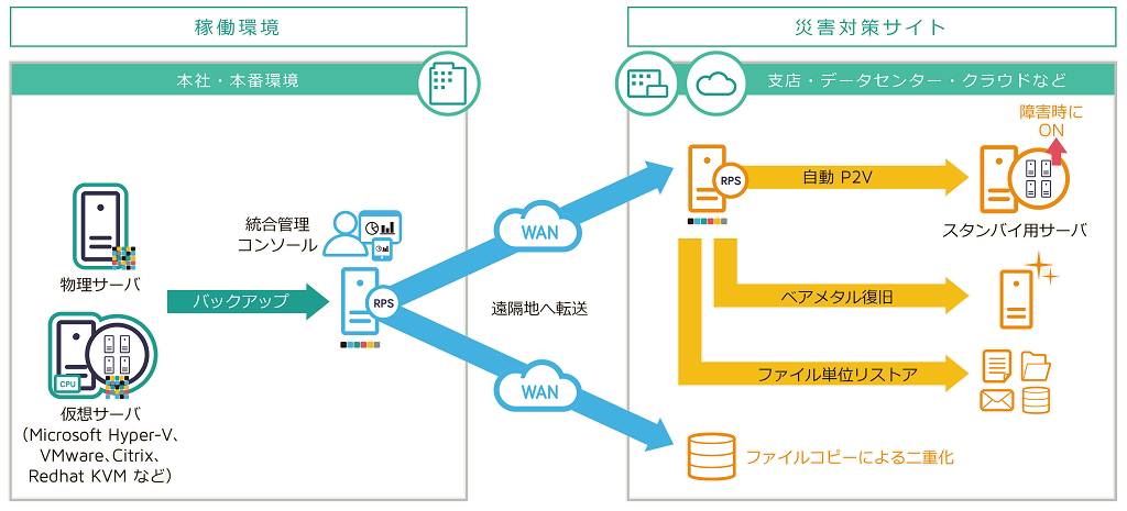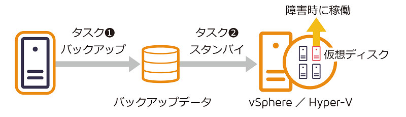 バックアッププランにて、あらかじめスタンバイ用の仮想基盤上にリストアしておきます。本番サーバに障害が発生したときには、仮想マシンを起動するだけで代替運用が可能です。スタンバイ用の仮想基盤を設定すれば災害時の継続運用も行えます。リモートへ仮想スタンバイする場合は、RPSが必要です。 |
