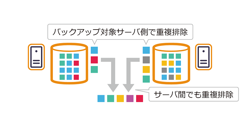 バックアップ対象サーバ(エージェント)側で重複を排除してバックアップします。さらにエージェント間でも重複が排除されます。バックアップデータ用のディスク使用量を大幅に削減することができます。 |