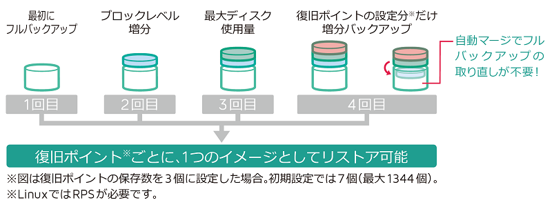 初回のフルバックアップ以降は、変更ブロックのみを増分バックアップし続けることでバックアップデータを削減し、バックアップ時間を短縮します。 設定した世代数を超えると一番古い増分バックアップとフルバックアップを自動的に合成(マージ)するので、フルバックアップの取り直しが必要ありません。 |