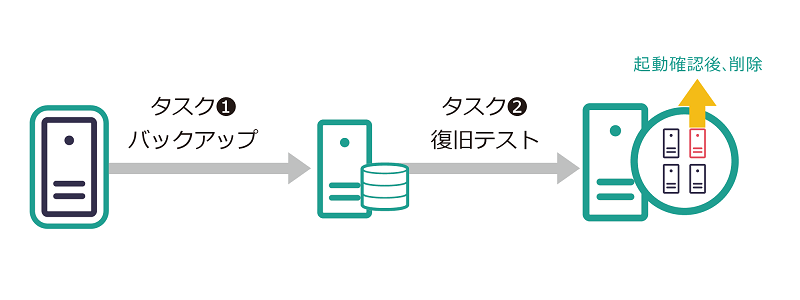 バックアップ完了後、復旧ポイント(バックアップデータ)で復旧テストを実行します。このテストは、インスタントVMの起動確認、または復旧ポイントをマウントしたファイル システムの健全性確認の2種類から選択できます。また、転送先でもテストを行うことができます。 |