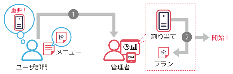 バックアップ方法をあらかじめメニュー化しておくことでシステムごとに要件を定めて設計する手間がなくなります。ユーザ部門に、システムの重要性に合わせてプランを選択してもらい、あとは対象システムを選択されたプランに割り当てるだけでバックアップが開始できます。 |