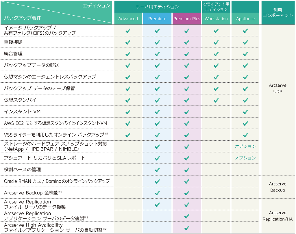 Arcserve UDP ライセンス一覧 (含まれる機能一覧)