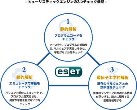 ESETは、ウイルス定義データベースを基盤とした従来型のウイルス対策ソフトとは異なる特長を備えています。独自開発の高度な検出システムであるヒューリスティック技術を20年以上前から製品に搭載。「静的解析(プログラムコード解析)」、「動的解析(エミュレータ)」、「遺伝子工学的解析(ジェネリックシグネチャ)」の3つの機能により、詳細な分析の実行と悪意のある振る舞いの特性を識別することで新種のウイルスなどの脅威に対処します。
