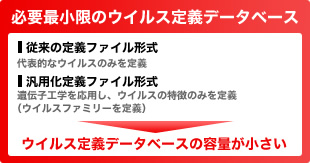 ESETセキュリティ ソフトウェア シリーズは、ウイルス定義データベースのファイルサイズが小さいことに加え、新種や亜種のウイルスを検出する独自開発のヒューリスティックエンジンと、2種類※のウイルス定義データベースを併せて利用した効率的なウイルス検出方法により、クライアントPCやサーバーの負荷を軽減することで軽快な動作を実現。