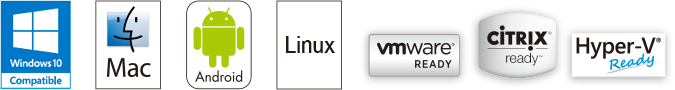 Windows、Mac、Linuxはもちろん、Androidまで多彩なOS環境に対応(マルチプラットフォーム)。また、メーカーのサポートが終了し てしまったレガシーOS(Windows 2000)から、最新バージョンのOSまで対応します。さらにVMwareやCitrix、Hyper-Vといった仮想環境にも対応。あらゆる環境でビジネスの効率化を向上させます。