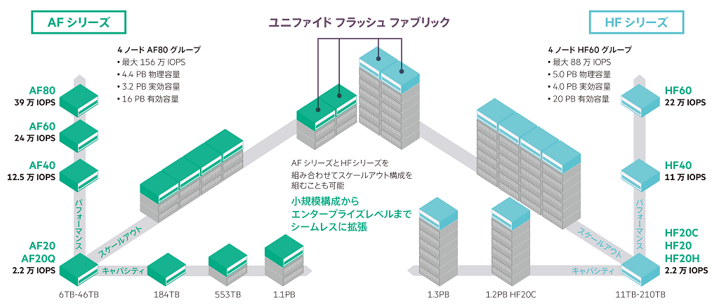 オールフラッシュ (SSD) の AFシリーズ、HDDとSSD を組み合わせたハイブリッドの HFシリーズの2シリーズを展開しており、いずれも単一アーキテクチャで構築されシームレスに連携して使用できます。