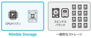 Nimble Storage HFシリーズは性能とディスク種別、本数が無関係なので、ディスクは安価で大容量ディスクのみを使用し、圧倒的な省スペース性と低消費電力を実現。