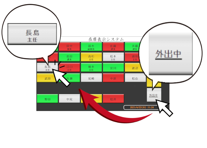 ボタンを押すだけで自身の在席状態を変更・周知することが可能です。
