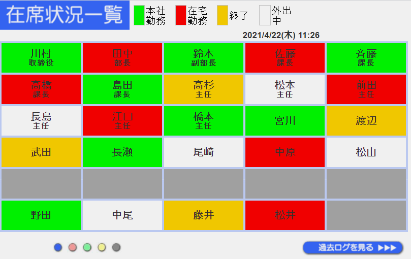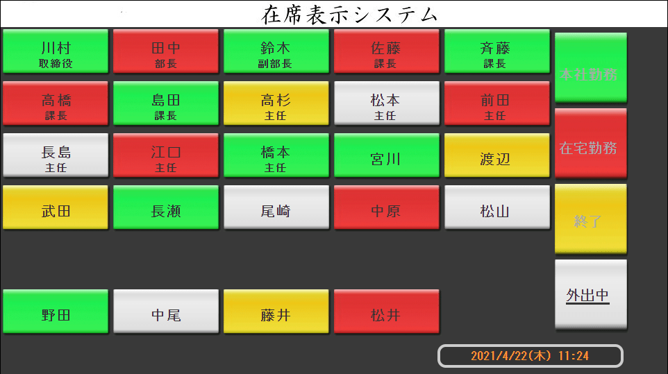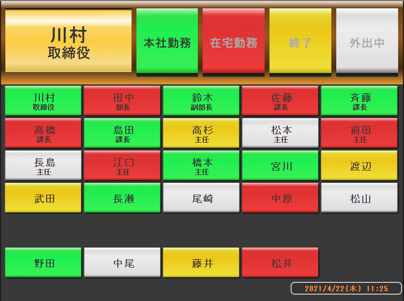 こちらは役員用の画面です。画面上部の在席状態を1回クリックするだけで、役員の方の在席状態を簡単に切替可能です。