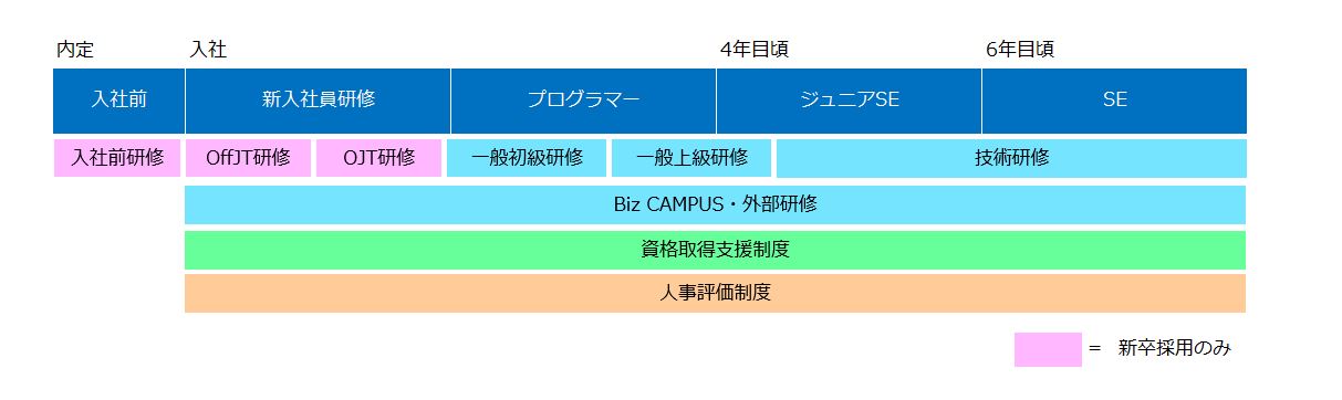 社内・社外勤務を問わず、一般職社員(2等級)としての能力を高め、技術部門においてはプロジェクトマネジメント、スタッフ部門においては職種別に必要な知識・能力を得ます。