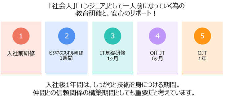 原則、入社後6か月間は業務に就かず、研修を通してしっかりと地力を付けていただき、人間関係も構築して欲しいと考えています。